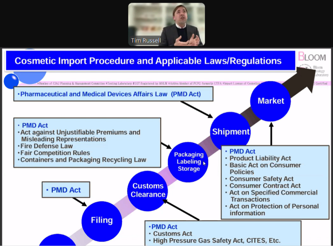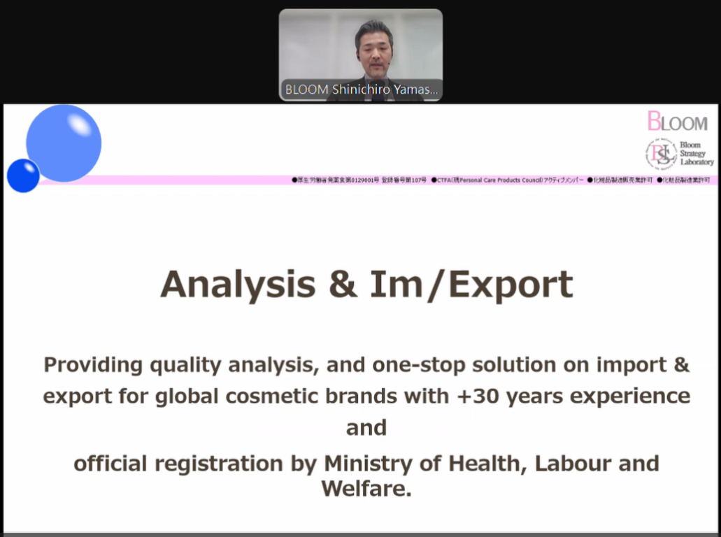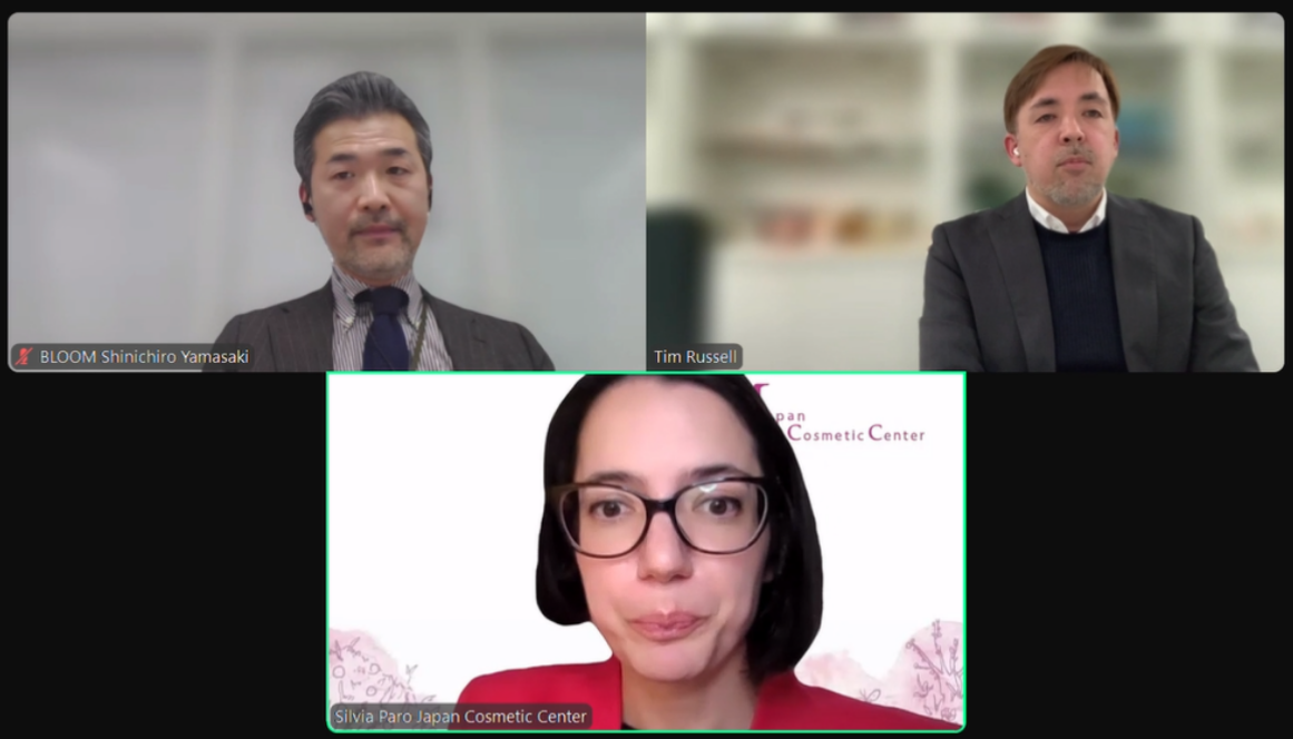 の共催で日本の化粧品市場に関するウェビナーを2部構成で開催いたしました。ウェビナーでは、特に海外から日本市場へのアクセスを目指す方々に向けた新たな機会を探ります。弊社からは、専務取締役 山﨑信一郎とティム ラッセルが第2部を担当いたしました。